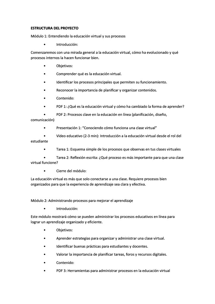 Este curso ofrece una visión general de la educación virtual, abordando sus fundamentos, herramientas tecnológicas y metodologías pedagógicas. Se analizan los procesos de enseñanza y aprendizaje en entornos digitales, así como los roles del docente y del estudiante. Además, se reflexiona sobre los desafíos, ventajas y buenas prácticas para lograr una experiencia educativa efectiva en línea.